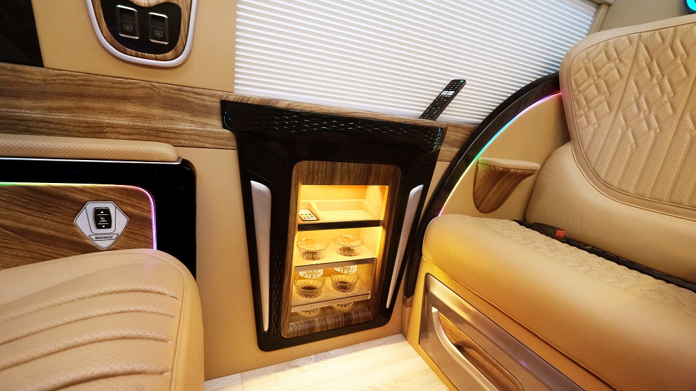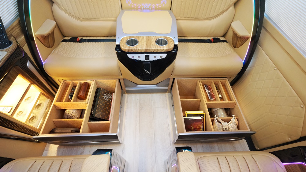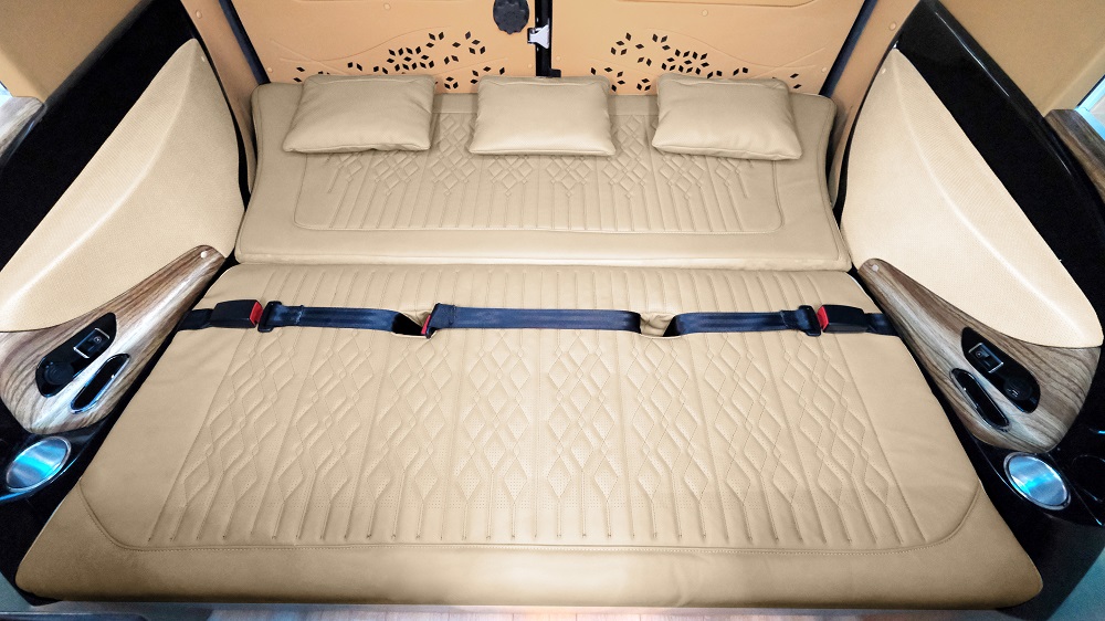 • 2 ghế vip diện tích ngồi bao la, nệm ghế được đúc nguyên khối tạo sự êm ái và ổn định khi xe di chuyển. Form ghế thiết kế với dài đèn viền tinh tế, có thể điều chỉnh tư thế nằm thoải mái nhất và ngã 180 độ thành 1 chiếc giường cho chuyến đi hoàn toàn thư giãn. Bàn tiện ích tích hợp trong gác tay. Option trang bị hệ thống massage túi khí để giải tỏa áp lực lên cột sống sau một ngày làm việc di chuyển bộn bề…tất cả kết thành chiếc ghế không chỉ sang trọng mà còn tốt cho sức khỏe xứng tầm chủ nhân. – Ghế băng 3 được lên thiết kế kỹ lưỡng với 2 công năng vừa là băng ghế sofa như đang ngồi trong phòng khách ở nhà, khi cần cũng có thể ngã thành 1 chiếc giường rộng rãi và êm ái.