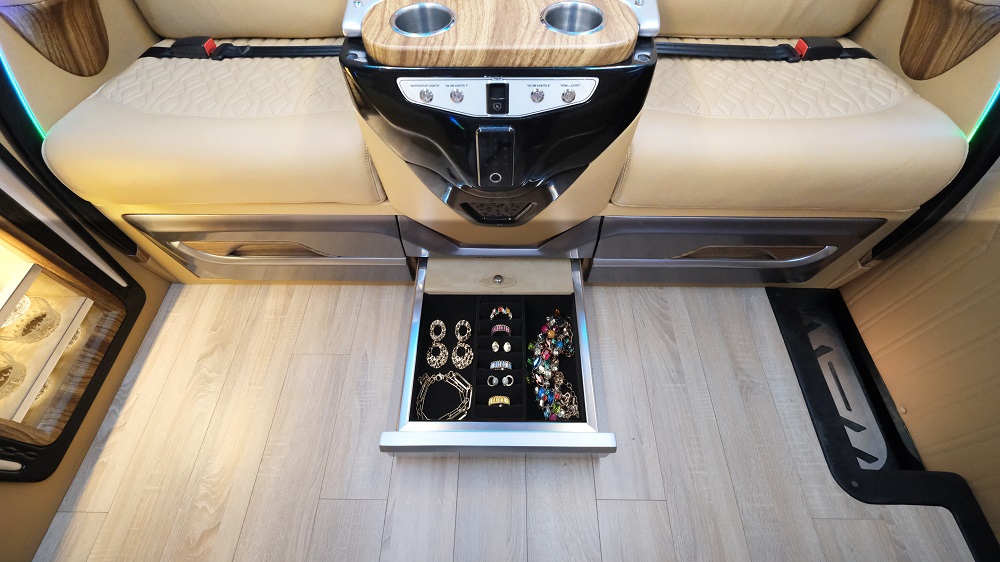 • 2 ghế quầy bar có thể đóng mở tiện dụng tạo không gian linh hoạt cho xe khi kết hợp với chiếc bàn chỉnh điện bất cứ khi nào chủ nhận cần có một phòng hội nghị di động.