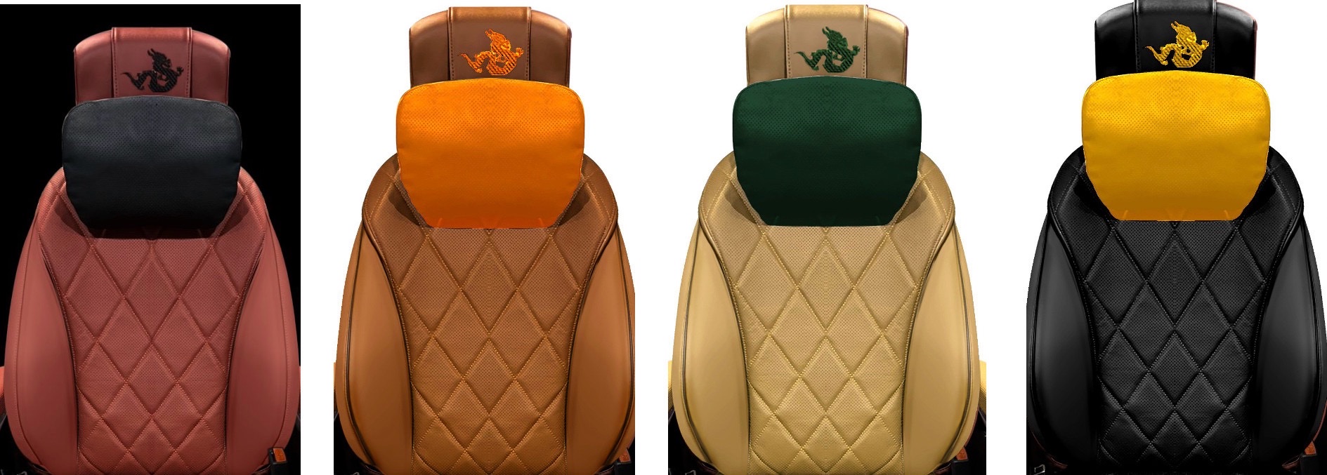 • Ghế ngồi siêu xe: Thiết kế kiểu dáng form ghế maybach style to rộng – tư thế ngồi công thái học cực kỳ thoải mái với hệ thống full massage – Đường chỉ may trên nền da thật cao cấp – Logo thương hiệu rồng nổi bật với từng màu phối nội thất